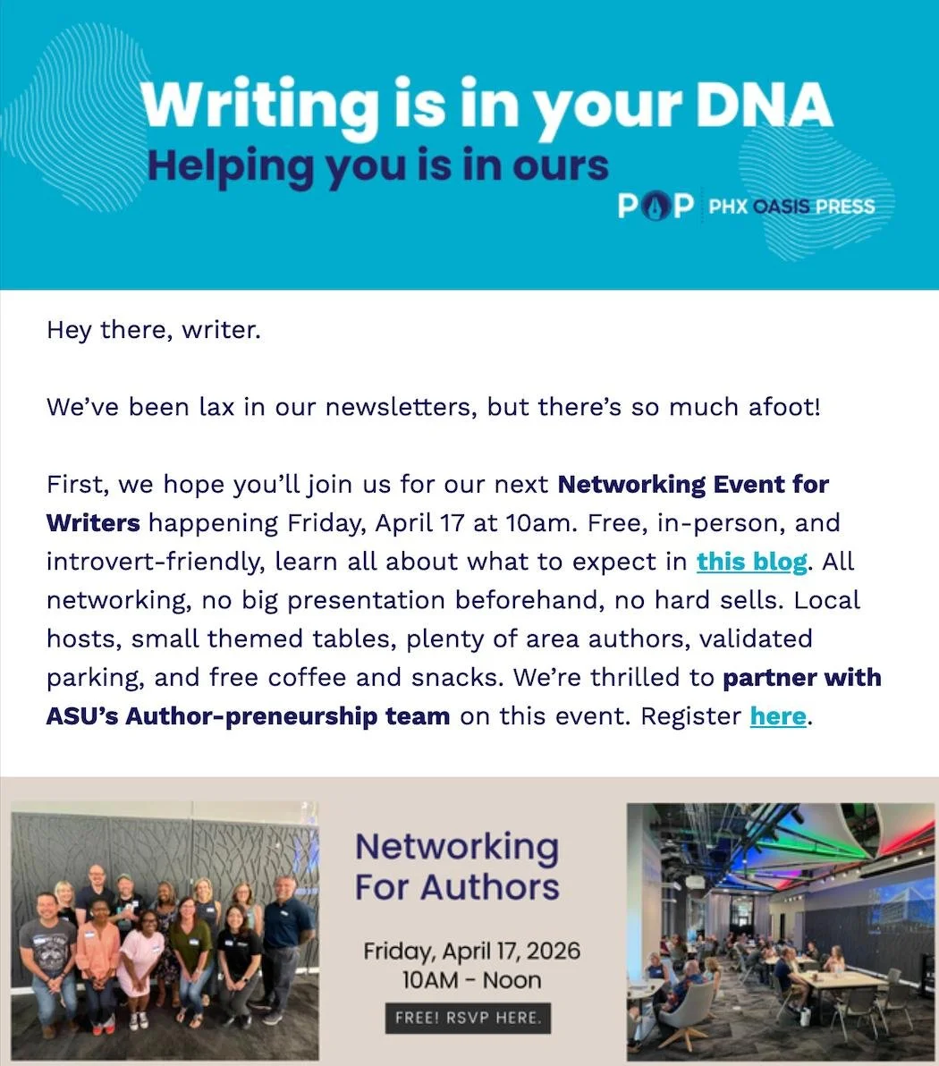 We help local authors bring new workshops to life, like Networking for Creative Writers, BLK WRDS Creative Writing Workshop, and more. Find POP events and select other AZ events on our event calendar. Send us your event for consideration.