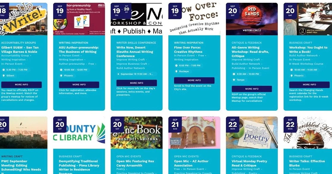 Thinking about writing doesn't put words on your page. Hold yourself accountable to meeting your weekly writing goals by joining our Thursday evening or Friday afternoon virtual writing sessions, each hosted by an AZ author. Sign up for free on our Meetup!